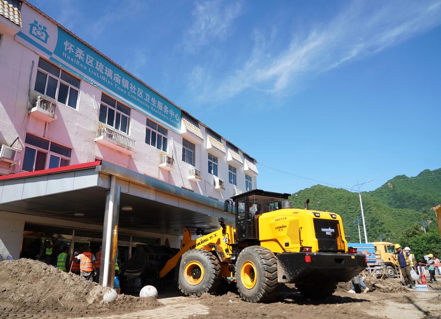 Rescatistas retiran limo en una clínica comunitaria, en el poblado de Liulimiao del distrito de Huairou, en Beijing, capital de China, el 30 de julio de 2025.…