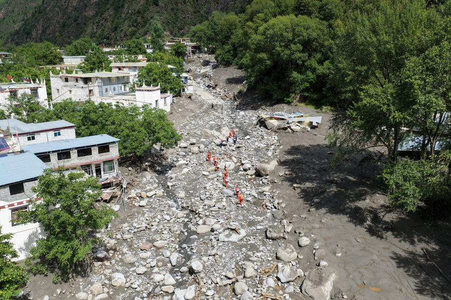 Vista aérea tomada con un dron el 5 de julio de 2025 de rescatistas buscando por sobrevivientes en el sitio de un deslizamiento de tierra, en el distrito de Rongchag, en la prefectura autónoma tibetana de Garze, en la provincia de Sichuan, en el suroeste de China.…