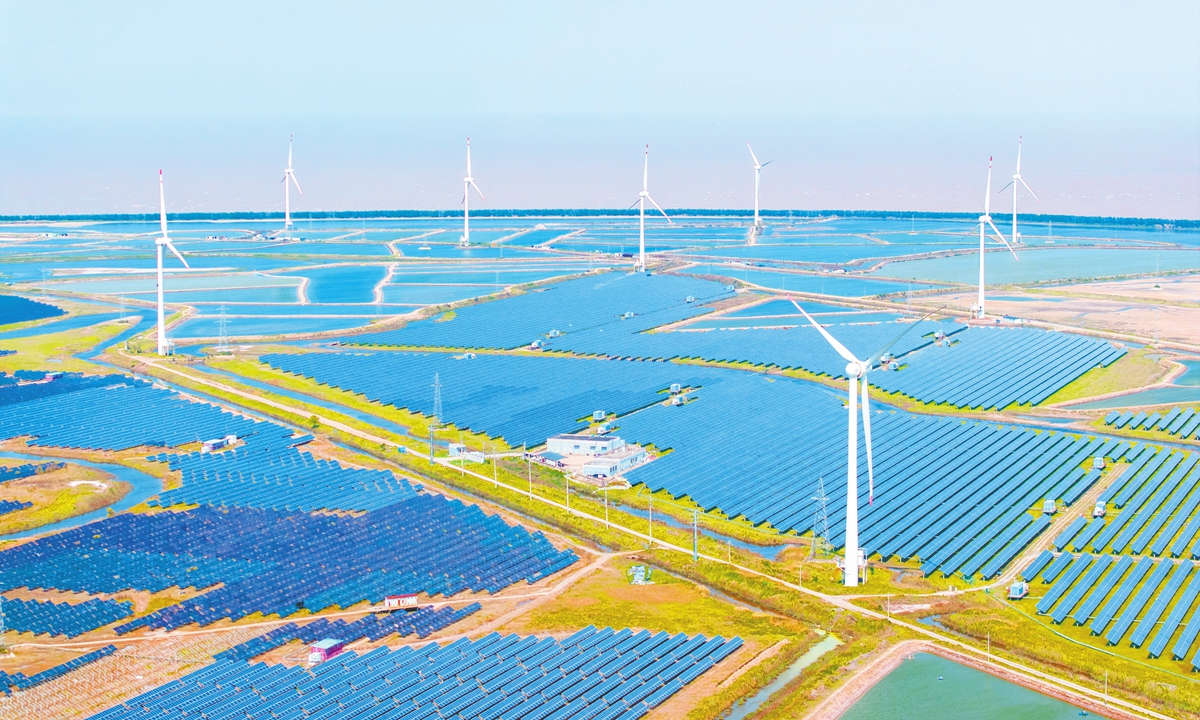 Vista de un proyecto que integra la generación de energía eólica y solar con la piscicultura en Yancheng, provincia de Jiangsu, este de China, el 28 de mayo de 2025.…