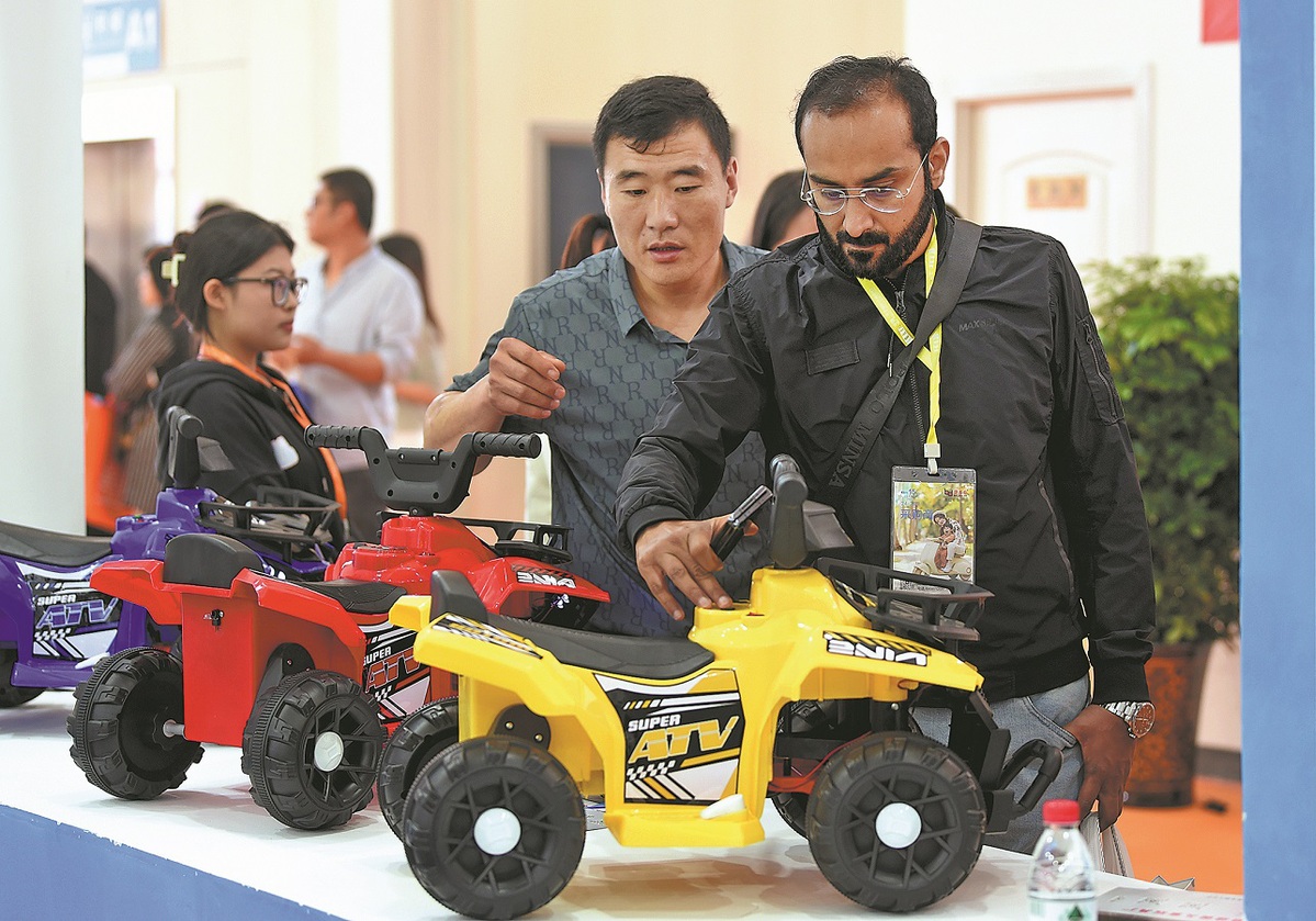 Un empresario extranjero visita la 17a Feria Internacional de Bicicletas, Carretas y Juguetes en el condado Pingxiang, provincia de Hebei, el 12 de abril de 2024.…