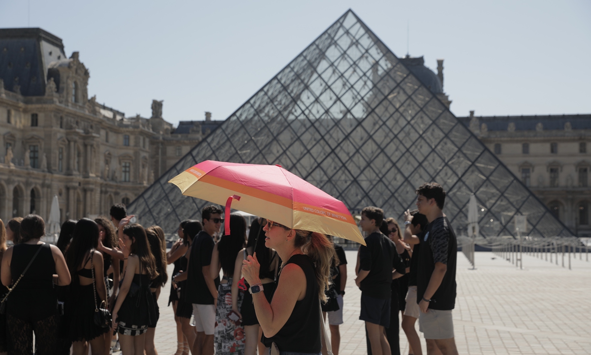 Las personas luchan por hacer frente al calor intenso mientras buscan sombra bajo paraguas para mantenerse frescos alrededor de la Pirámide del Louvre en París, Francia, el 1 de julio de 2025.…