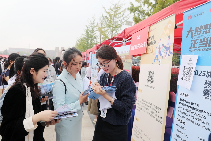 Estudiantes universitarios buscan empleo en una feria de trabajo celebrada en el campus de la Universidad Normal de Huaibei en Huaibei, provincia de Anhui, 16 de octubre de 2024.…