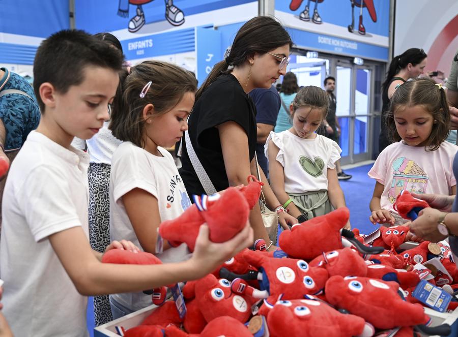 Personas compran productos de la mascota olímpica Phryge en una tienda oficial de los Juegos Olímpicos de París 2024, situada en la avenida Champs-Elysees en la capital de Francia, el 27 de junio de 2024.…