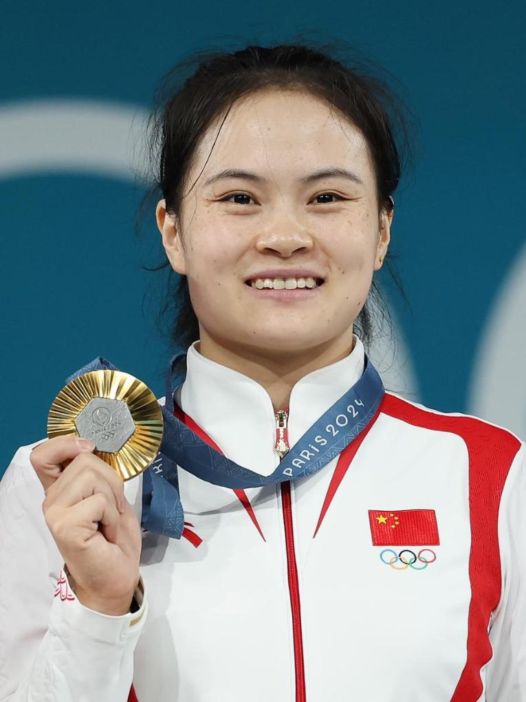 La medallista de oro Luo Shifang de China asiste a la ceremonia de premiación al término de la competencia de 59kg femenino de halterofilia en los Juegos Olímpicos de París 2024, en París, Francia, el 8 de agosto de 2024.…