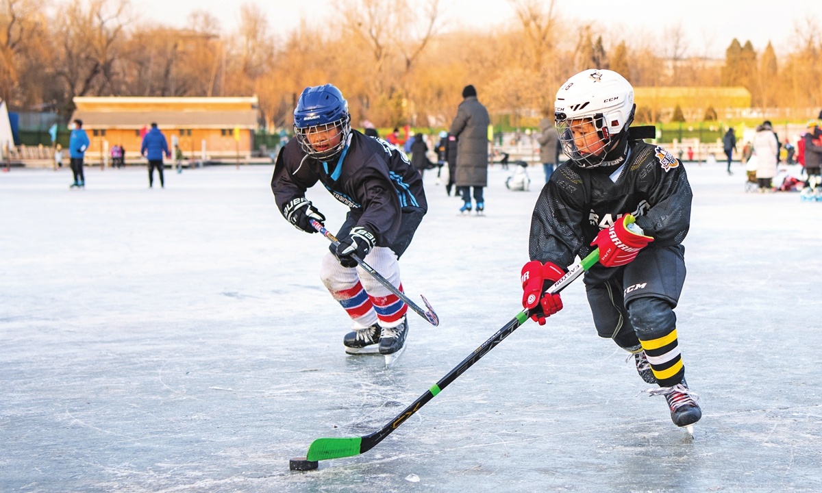 Ni?os juegan hockey sobre hielo en el lago congelado del parque Yuyuantan de Beijing.…