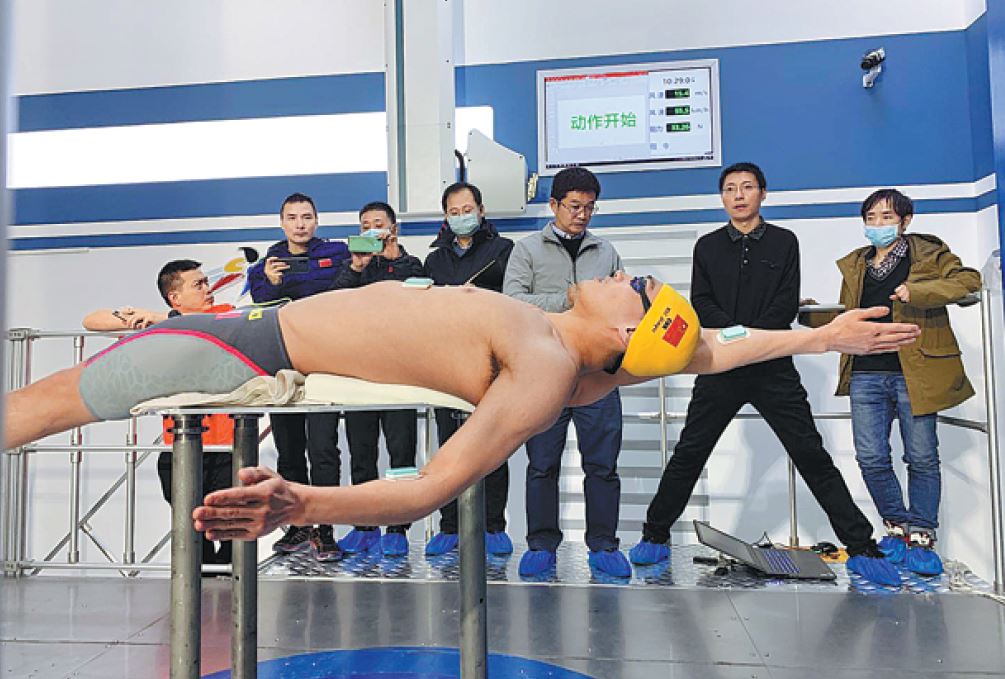 Nadador participa en un entrenamiento en un túnel de viento de la Academia de Aerodinámica Aeroespacial de China, Beijing, octubre del 2021.…