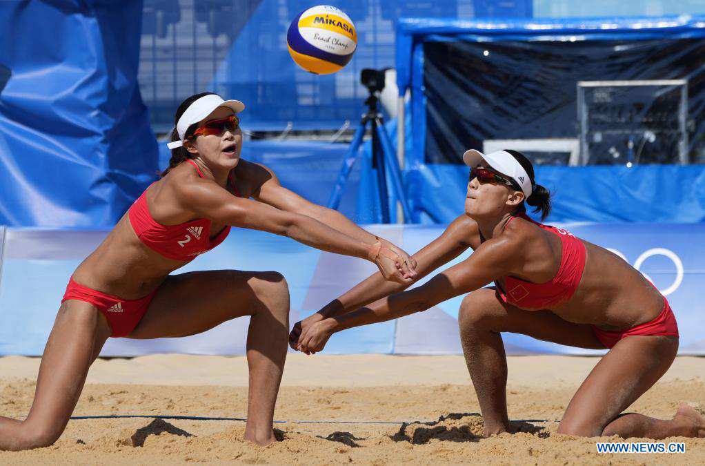 Xue Chen (a la derecha) y Wang Xinxin salvan la pelota durante el partido preliminar de voleibol de playa femenino contra Estados Unidos en los Juegos Olímpicos Tokío 2020, Japón, 25 de julio del 2021.…