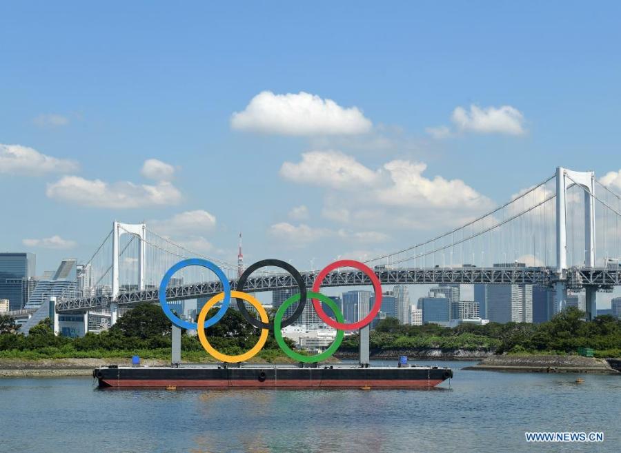 Anillos Olímpicos en la Bahía de Tokío, Japón.…