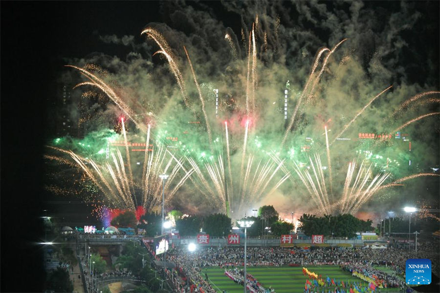 Imagen del 20 de julio de 2024 de un espectáculo de fuegos artificiales al término del partido final entre la aldea de Dangxiang y la aldea de Dongmen, en la Super Liga de las Aldeas, en el distrito de Rongjiang, en la provincia de Guizhou, en el suroeste de China.…