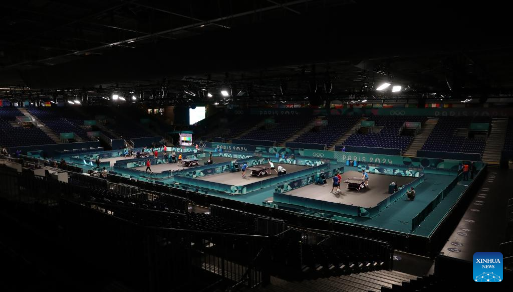 El equipo nacional chino de tenis de mesa asiste a una sesión de entrenamiento para los Juegos Olímpicos de París 2024 en la París Sur Arena, en París, Francia, el 22 de julio de 2024.…