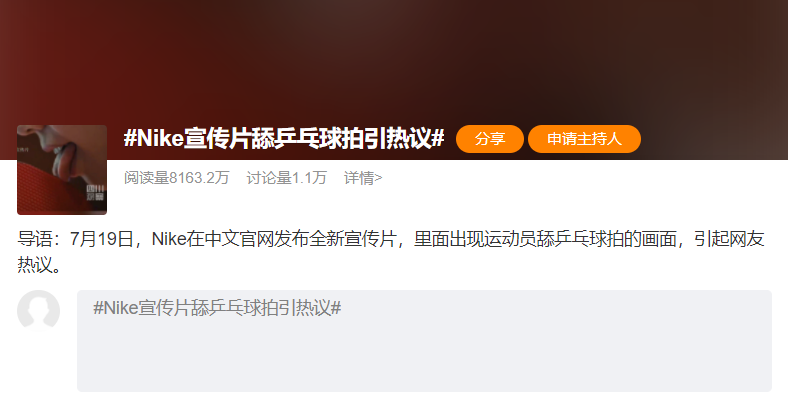 El hashtag "Nike promotional video lamiendo paleta de tenis de mesa" obtiene más de 81 millones de visitas en Sina Weibo, 23 de julio del 2024.…