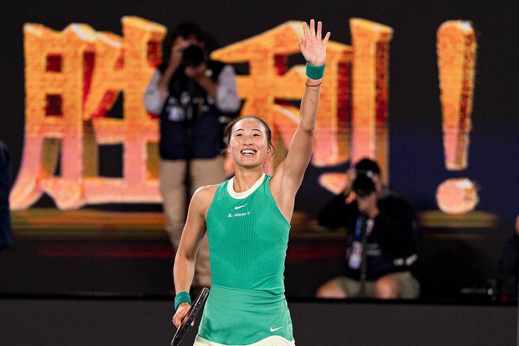 La china Zheng Qinwen celebra la victoria contra la ucraniana Dayana Yastremska después de su partido de semifinales individuales femeninas el día 12 del torneo de tenis Abierto de Australia en Melbourne el 25 de enero de 2024.…