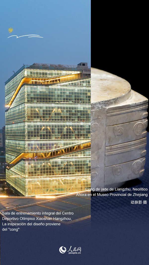 En la sala de entrenamiento integral del Centro Deportivo Olímpico con forma de cong de jade podemos ver el proceso de civilización ininterrumpido de la prehistórica Hangzhou como un río; en la sala de balonmano, que se asemeja a una "cortina de agua" podemos ver de una peque?a monta?a de la ciudad en las dinastías Qin y Han hasta la nueva ciudad portuaria de los últimos 800 a?os.…