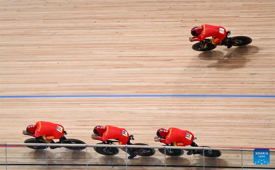 Atletas de China compiten durante la final masculina de persecución por equipos de Ciclismo en Pista en los XIX Juegos Asiáticos, en Hangzhou, en la provincia de Zhejiang, en el este de China, el 27 de septiembre de 2023.…