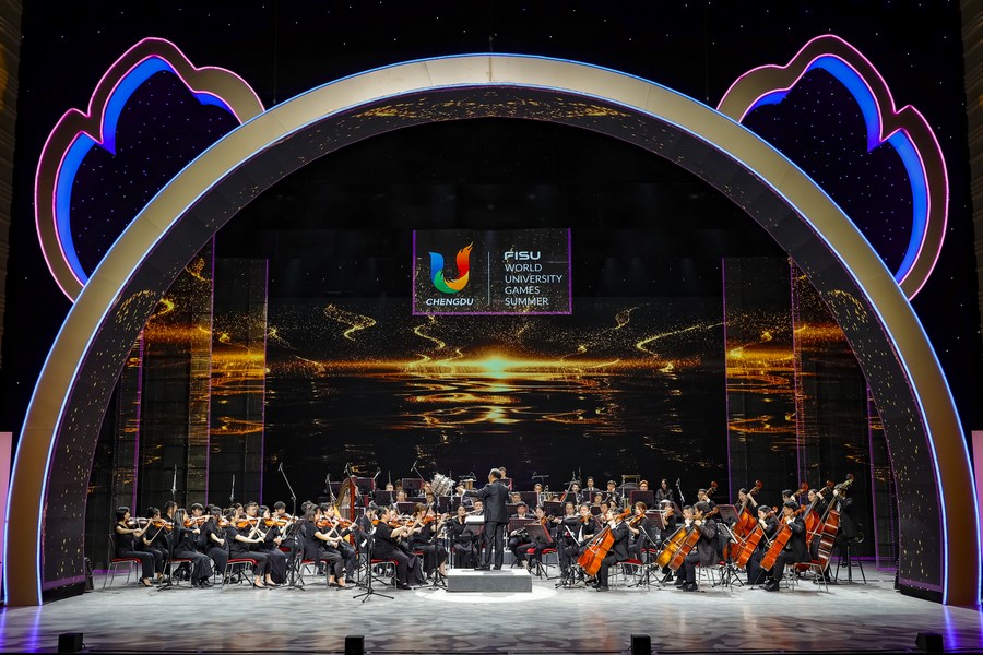 Músicos tocan durante el concierto Sue?os de Verano en la Villa de la 31a edición de verano de los Juegos Mundiales Universitarios de la FISU, en Chengdu, en la provincia de Sichuan, en el suroeste de China, el 30 de julio de 2023.…