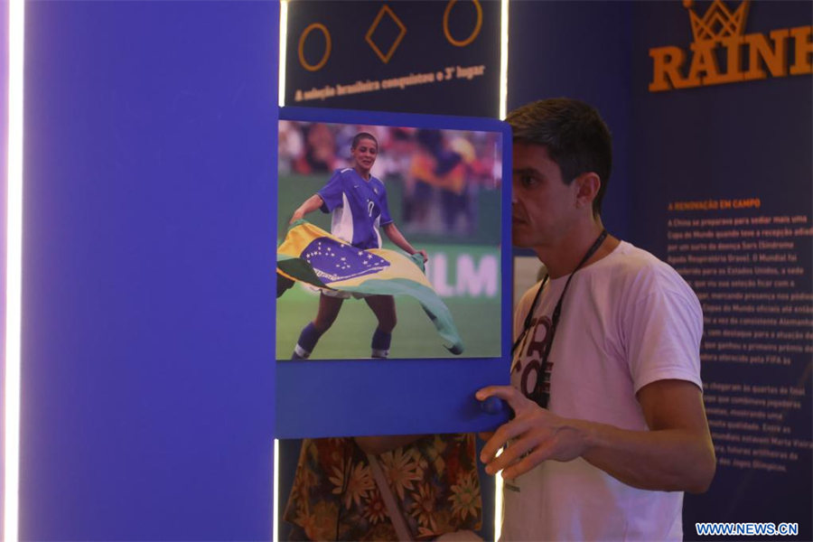 Un hombre visita la exposición "Rainhas de Copas", sobre la historia del fútbol femenino en Brasil, en el Museo del Fútbol, en Sao Paulo, Brasil, el 21 de julio de 2023.…