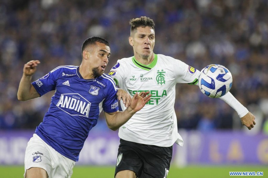 Imagen del 3 de mayo de 2023 del jugador Daniel Giraldo (i), de Millonarios de Colombia, disputando el balón con Ale (d), de América-MG de Brasil, durante un partido correspondiente a la jornada 3 de la Copa Conmebol Sudamericana 2023, celebrado en el Estadio El Campín, en Bogotá, Colombia. (Xinhua/Str)…