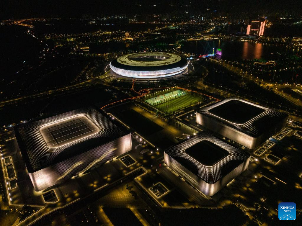 Vista aérea del 19 de abril de 2023 de las sedes en el espectáculo de luces para la cuenta regresiva de 100 días para los Juegos Mundiales Universitarios de FISU Chengdu 2021 en el Parque Deportivo del Lago Dong'an, en Chengdu, en la provincia de Sichuan, en el suroeste de China.…
