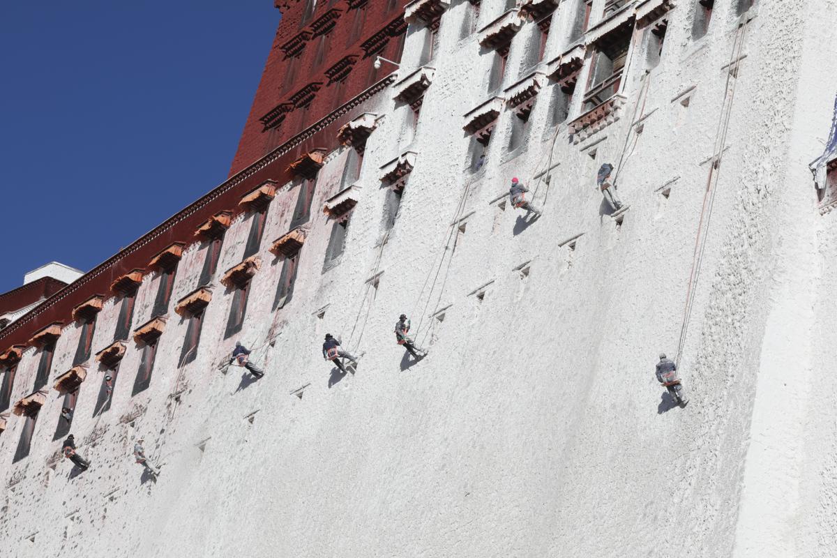 Los residentes de Lhasa se unen para pintar el Palacio de Potala como parte de la tradición anual