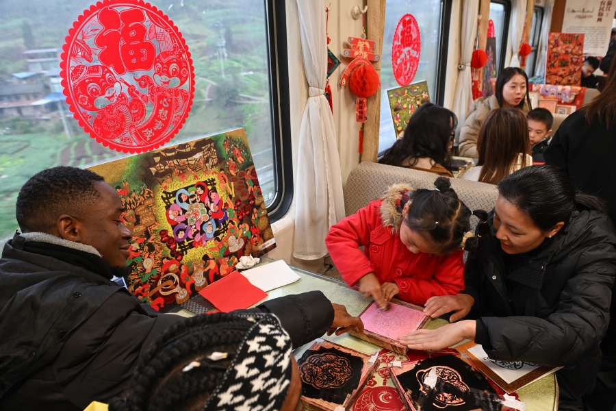 Visitantes extranjeros participan en una actividad cultural a bordo de un tren en Qijiang, 12 de febrero del 2025.…