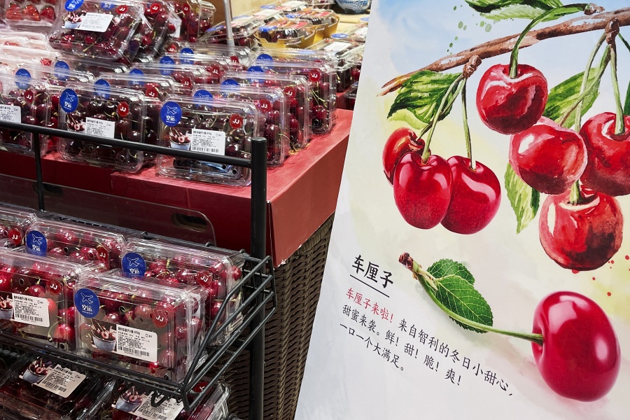 Cerezas importadas de Chile se venden en un supermercado de Beijing, 27 de noviembre del 2021.…