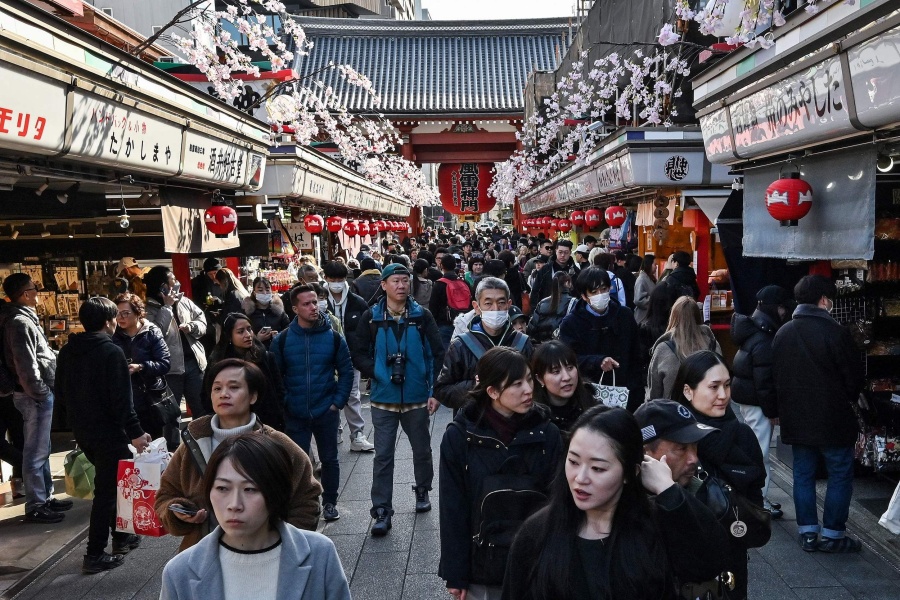 Turistas extranjeros visitaron el distrito de entretenimiento Asakusa de Tokio el 21 de febrero de 2025.…