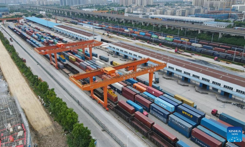 Esta fotografía aérea tomada el 1 de agosto de 2024 con un dron muestra una vista de la base logística de la estación ferroviaria norte de Hefei en Hefei, provincia oriental china de Anhui.…