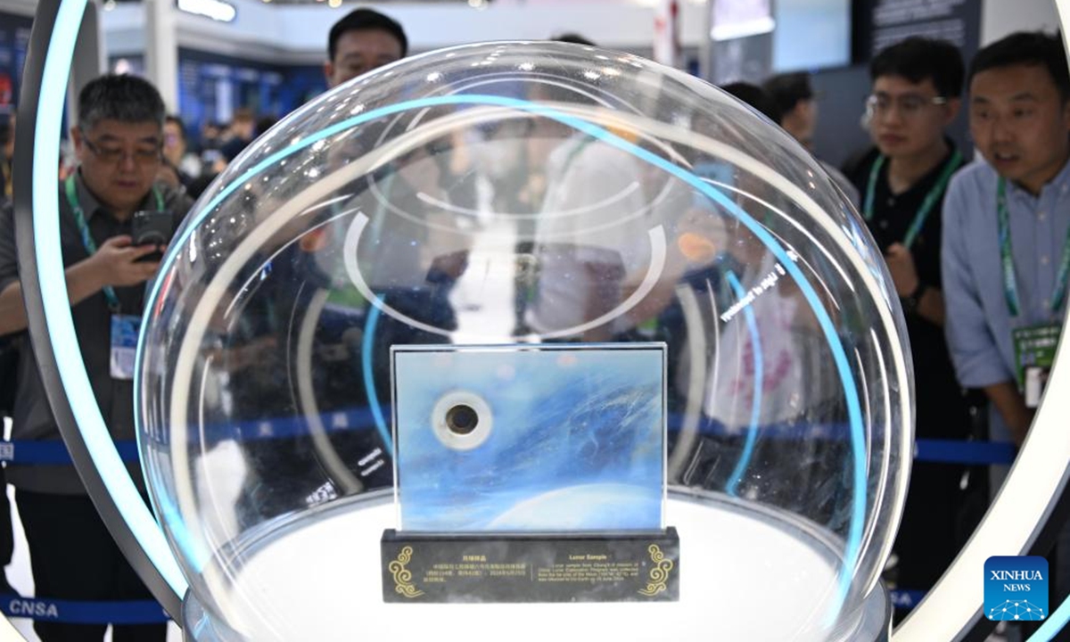 Visitantes observan muestras lunares de la misión Chang'e-6, recolectadas del otro lado de la Luna, en exhibición en la 15a Exposición Internacional de Aviación y Aeroespacial de China en Zhuhai, provincia de Guangdong, en el sur de China, el 13 de noviembre de 2024.…