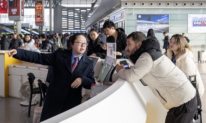 El personal ferroviario ayuda a los pasajeros extranjeros en la estación de ferrocarril del este de Chengdu, en Chengdu, provincia de Sichuan, suroeste de China, el 13 de enero de 2025.…
