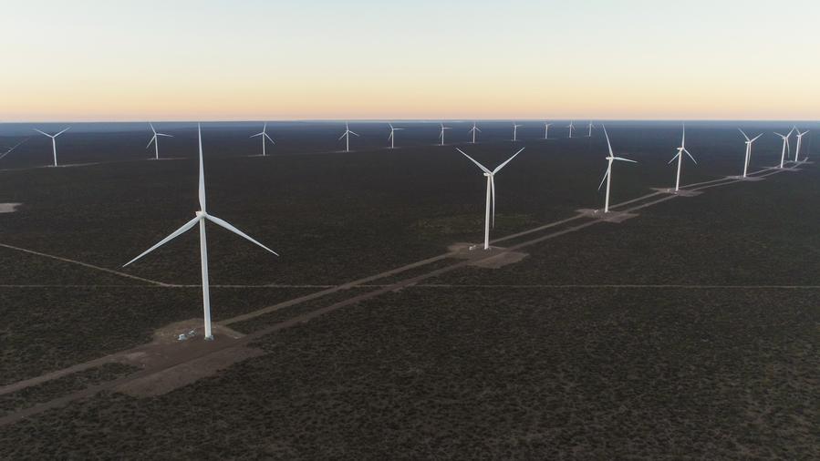 Imagen tomada con un dron del 10 de abril de 2021 del complejo eólico "Loma Blanca", construido por las empresas Goldwind y PowerChina Ltd.…