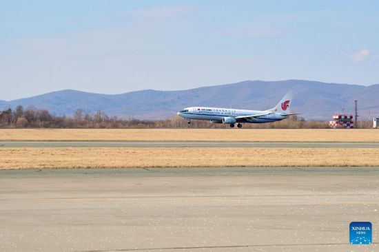 VLADIVOSTOK, 1 abril, 2025 (Xinhua) -- Imagen del 31 de marzo de 2025 del vuelo inaugural de una nueva ruta Beijing-Vladivostok lanzada por Air China llegando al Aeropuerto Internacional de Vladivostok, en Vladivostok, Rusia.…