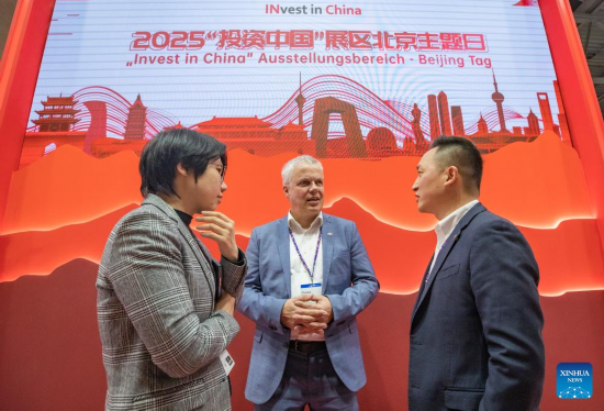 HANNOVER, 2 abril, 2025 (Xinhua) -- Imagen del 1 de abril de 2025 de personas conversando en el estand de exposición de "Invest in China" en la Hannover Messe 2025, en Hannover, Alemania.…