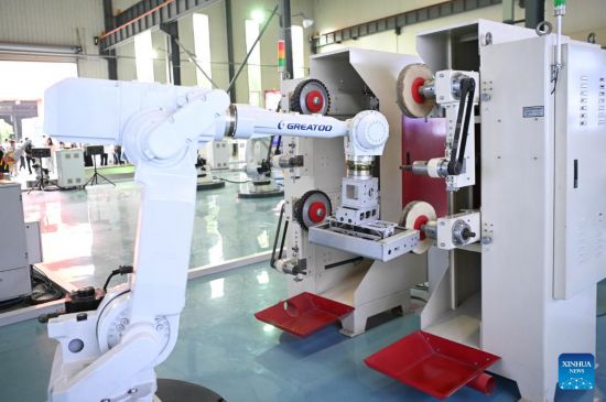 GUANGZHOU, 30 junio, 2025 (Xinhua) -- Imagen del 29 de junio de 2025 de un brazo robótico rectificando una unidad en Greatoo Intelligent, en Jieyang, en la provincia de Guangdong, en el sur de China.…