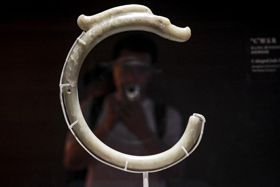 Un visitante toma fotos de una exhibición durante una vista previa para los medios de comunicación de la exposición "Leyendas del Dragón: La Antigua Civilización de la Cultura Hongshan" en el Museo de Shanghai, en el este de China, el 25 de junio de 2025.…