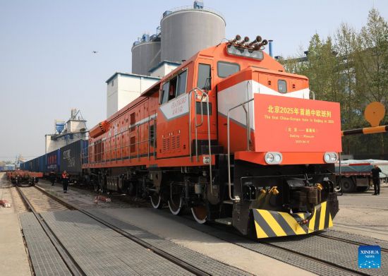BEIJING, 16 abril, 2025 (Xinhua) -- Un tren de carga China-Europa con destino a Moscú, Rusia, espera para partir en un centro logístico, en Beijing, capital de China, el 16 de abril de 2025.…