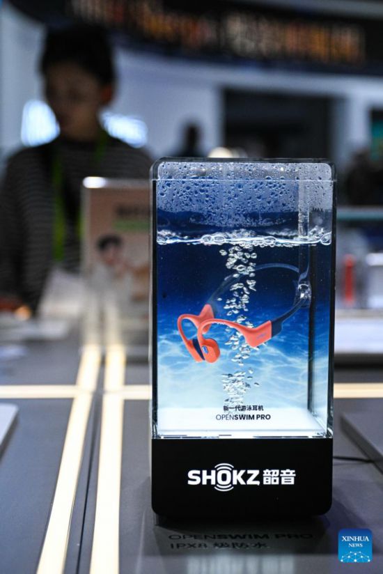 HAIKOU, 16 abril, 2025 (Xinhua) -- Imagen del 15 de abril de 2025 de auriculares impermeables para nadar en la V Exposición Internacional de Productos de Consumo de China (CICPE, por sus siglas en inglés), en Haikou, en la provincia de Hainan, en el sur de China.…