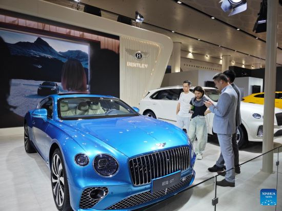 HAIKOU, 16 abril, 2025 (Xinhua) -- Imagen del 15 de abril de 2025 de visitantes observando un automóvil Bentley en la V Exposición Internacional de Productos de Consumo de China (CICPE, por sus siglas en inglés), en Haikou, en la provincia de Hainan, en el sur de China.…