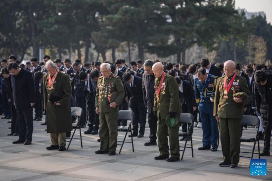 SHENYANG, 25 octubre, 2025 (Xinhua) -- Veteranos de los Voluntarios del Pueblo Chino (VPCh) guardan un momento de silencio durante una ceremonia de presentación de cestas de flores en el cementerio de los mártires de los VPCh, en Shenyang, en la provincia de Liaoning, en el noreste de China, el 25 de octubre de 2025.…