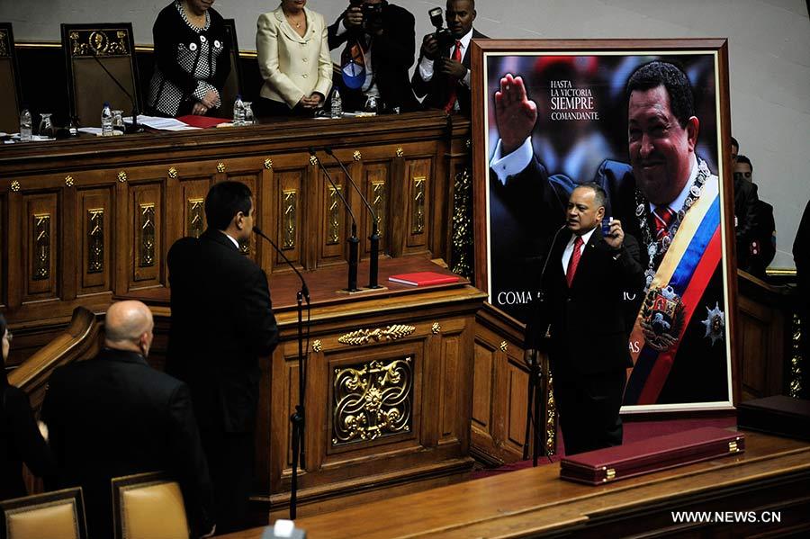 CARACAS, 19 abr (Xinhua) -- Nicolás Maduro Moros juró hoy como presidente Constitucional de la República Bolivariana de Venezuela ante la Asamblea Nacional (Congreso), en la sede del Poder Legislativo ubicada en el centro de Caracas.