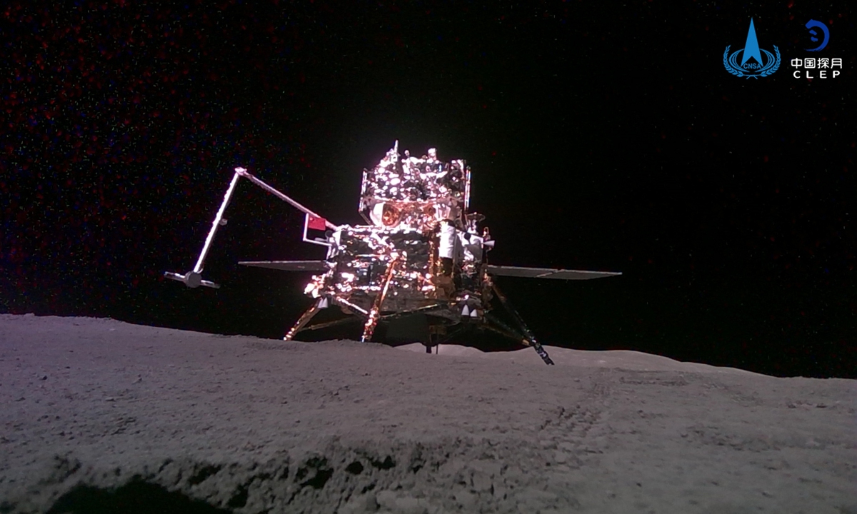 Una imagen del módulo de aterrizaje y del vehículo ascensor de la sonda lunar Chang’e-6 en la superficie del lado oculto de la luna tomada por una cámara móvil, 3 de junio del 2024.…