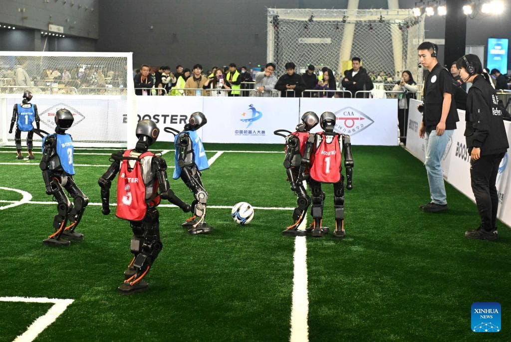 Robots son vistos durante un partido de fútbol en el Centro Internacional de Convenciones y Exposiciones, en Shijiazhuang, en la provincia de Hebei, en el norte de China, el 17 de octubre de 2025.…