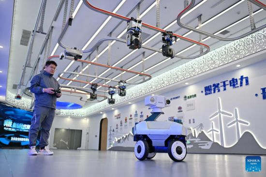 SHIJIAZHUANG, 31 marzo, 2025 (Xinhua) -- Imagen del 26 de marzo de 2025 de un empleado adjustando un robot patrulla en una base de pruebas piloto, en la Nueva Area de Xiong'an, en la provincia de Hebei, en el norte de China.…