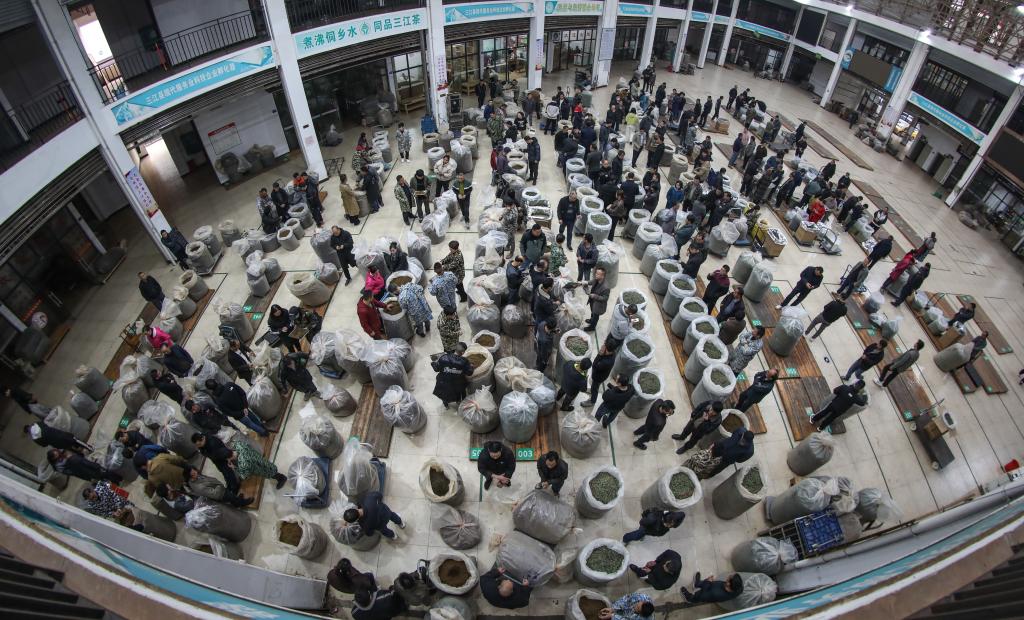 SANJIANG, 23 marzo, 2025 (Xinhua) -- Imagen del 22 de marzo de 2025 de un mercado de comercio de té, en el distrito autónomo dong de Sanjiang, en la región autónoma zhuang de Guangxi, en el sur de China.…