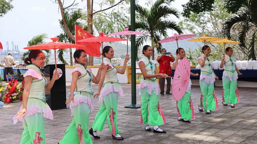 Imagen proveída por la Embajada de China en Panamá del 28 de marzo de 2025 de bailarinas presentando danzas tradicionales chinas durante un evento para celebrar los 171 a?os de presencia de la comunidad china en Panamá en el Parque del Mirador del Puente de las Américas, en la Ciudad de Panamá, capital de Panamá.…
