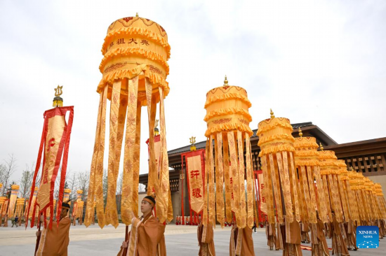 XINZHENG, 31 marzo, 2025 (Xinhua) -- Artistas asisten a una ceremonia para adorar a Huangdi, un legendario ancestro común de todos los chinos, en la ciudad de Xinzheng, en la provincia de Henan, en el centro de China, el 31 de marzo de 2025.…