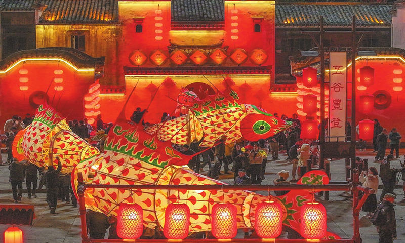 Grupo de danza de linternas con forma de pez en el distrito Huizhou de Huangshan, provincia de Anhui, este de China, el 15 de enero de 2025.…