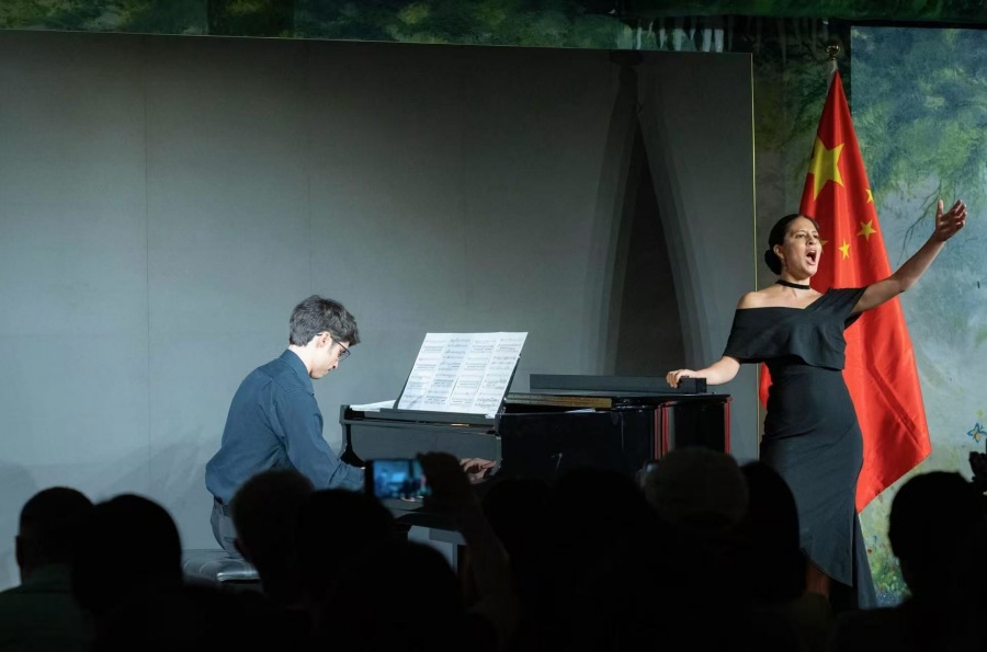 La soprano Andrea Lara y el pianista José González Barrera actúan en el Garden Teather del JinShang Yuan, Beijing, 25 de julio del 2025.…