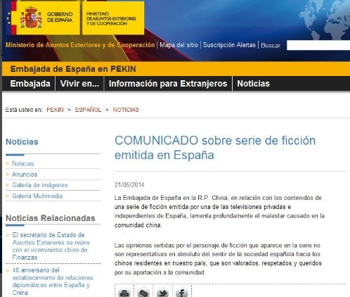 La Embajada de Espa?a en la R.P. China, en relación con los contenidos deuna serie de ficción emitida por una de las televisiones privadas eindependientes de Espa?a, lamenta profundamente el malestar causado en lacomunidad china.