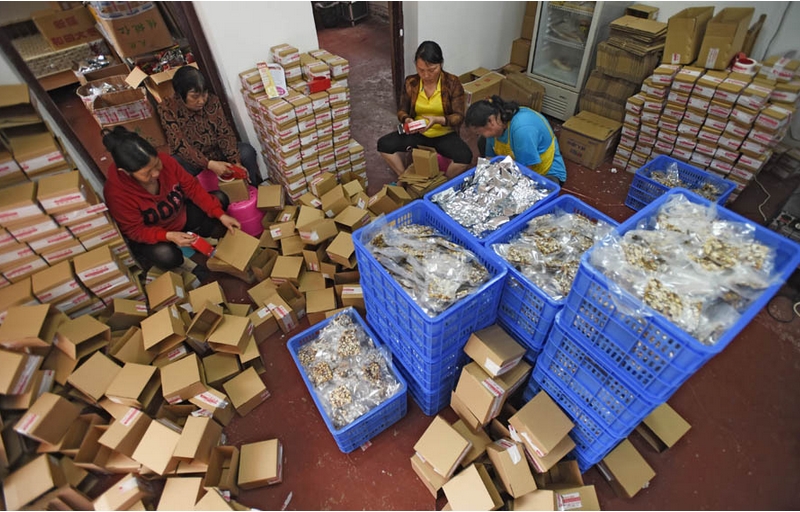 Las empleadas colocan cada paquete en una caja para enviarlas posteriormente, en el taller de Changsha, en la provincia de Hunan, el 22 de mayo de 2014. Los paquetes serán enviados por todo el país. [Foto/Xinhua]