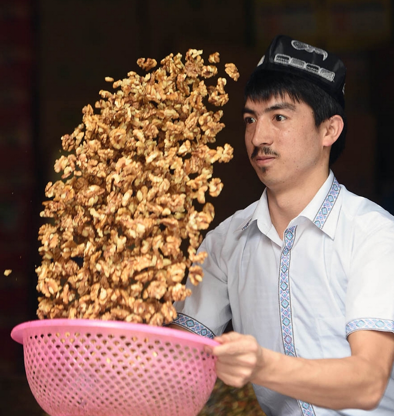 Adili remueve las nueces en el taller de Changsha, en la provincia de Hunan, el 22 de mayo de 2014. [Foto/Xinhua]